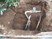 | 基礎の撤去終了後に地中埋設物の確認・撤去作業に入ります。 浄化槽や水道管等、不要なものは撤去することが重要です。 水道管は水道局にどこまで撤去して良いのか確認する必要があります。 そうした廃棄物も含め地中に不要物がある場合は全て撤去することが重要です。 |