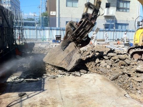 | 内装材・設備の撤去を終えたあとに建物本体の解体へ入ります。 ほこりや粉塵の飛散を防ぐため放水しながら重機を使用して一気に建物を壊します。 |